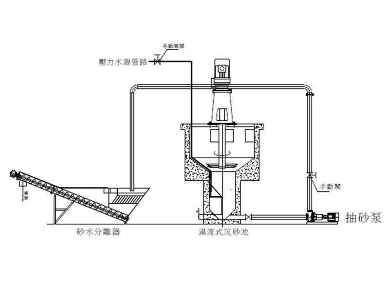 渦流沉砂池之除砂機由驅動系統、攪拌旋槳葉、吸砂系統、電控系統等組成。吸砂系統可以採用空氣提升或泵吸等方式。 在沉砂池中央,立式攪拌機控制水流的流速,對夾帶大量黏附有機物的砂粒進行多次翻滾清洗,促使其表面的有機物徹底分離。砂的自重力和渦流作用使砂向中心砂斗下沉,剝離的有機物隨軸向水流向上溢走。下部砂斗積聚濃度較高的砂層經過空氣提升或砂泵提升,進入池外螺旋砂水分離器內,砂粒分離外排,污水回流至集水渠。